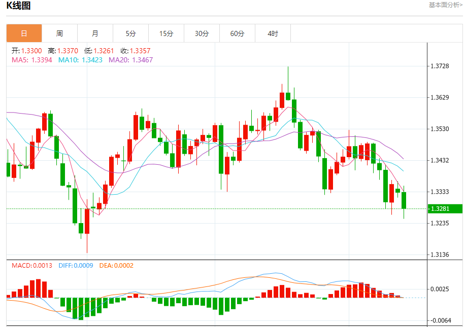周二盘中,英镑/美元报1.3281,跌幅0.38%。 今日分析:在1.3365之下,看跌,目标价位为1.3250,然后为1.3225。 技术点评:RI技术指标看跌,有进一步向下趋势。 支撑位:1.32501.32251.3200 阻力位:1.34201.33901.3365 (亚汇网编辑:冰凡)