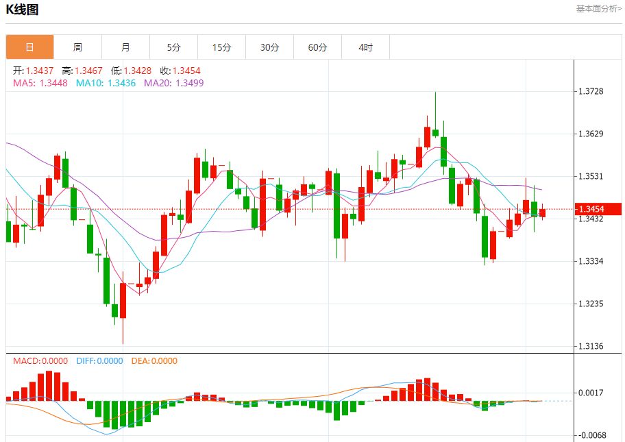周四盘中,英镑/美元报1.3456,跌幅0.13%。 今日分析:在1.3455之上,看涨,目标价位为1.3525,然后为1.3560。 技术点评:即使我们不能排除持续调整的可能性,其时间长度上,应该是有限的。 支撑位:1.34551.34351.3410 阻力位:1.35801.35601.3525 (亚汇网编辑:冰凡)