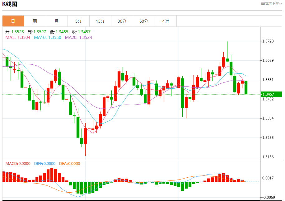周三盘中,英镑/美元报1.3446,跌幅0.58%。 今日分析:在1.3500之下,看跌,目标价位为1.3450,然后为1.3420。 技术点评:跌破1.3500支撑位后,将会引发加速下跌至目标位1.3450。 支撑位:1.34501.34201.3395 阻力位:1.35601.35351.3500 (亚汇网编辑:冰凡)