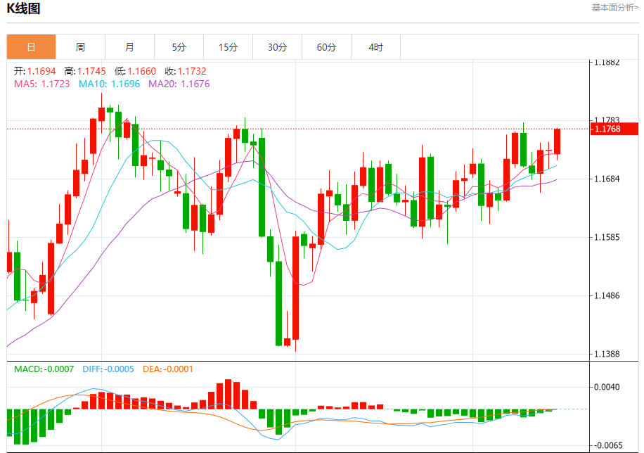 周一盘中,欧元/美元报1.1771,涨幅0.35%。 今日分析:在1.1740之上,看涨,目标价位为1.1770,然后为1.1780。 技术点评:RI技术指标看涨,有进一步向上趋势。 支撑位:1.17401.17201.1700 阻力位:1.18001.17801.1770 (亚汇网编辑:冰凡)