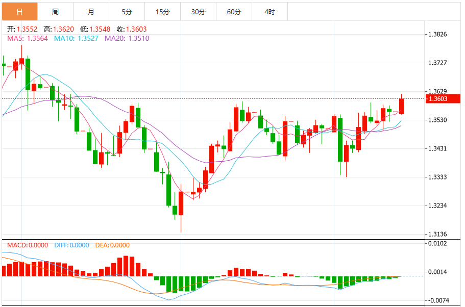 周一盘中,英镑/美元报1.3611,涨幅0.38%。 今日分析:在1.3555之上,看涨,目标价位为1.3625,然后为1.3660。 技术点评:RI技术指标呈现继续上升趋势。 支撑位:1.35551.35201.3500 阻力位:1.37001.36601.3625 (亚汇网编辑:冰凡)