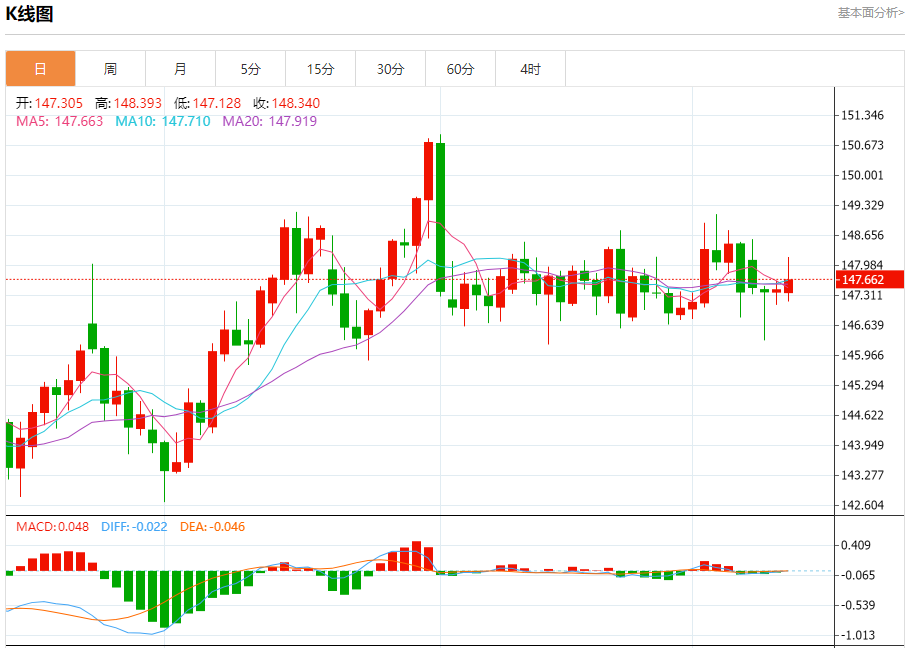 周四盘中,美元/日元报147.440,跌幅0.01%。 今日分析:看跌,在147.79之下。 技术点评:RI技术指标小于中性区域50。ACD技术指标处在其信号线之下看空。配置为负。此外,价位低于其20天及50天移动平均线(分别位于147.44和147.41)。 支撑位:146.42146.12145.83 阻力位:148.57148.28147.7