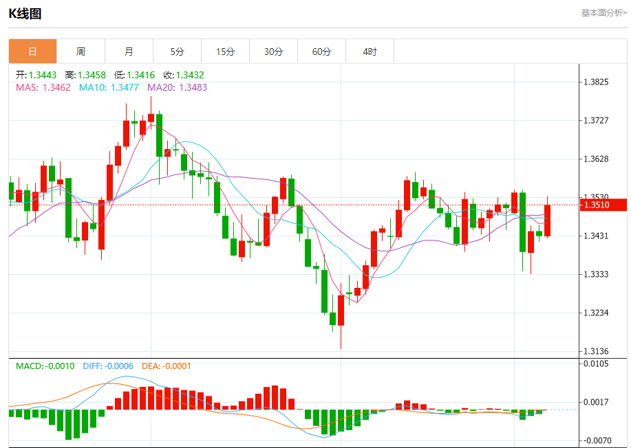 周五盘中,英镑/美元报1.3511,涨幅0.58%。 今日分析:在1.3435之上,看涨,目标价位为1.3500,然后为1.3550。 技术点评:RI技术指标看涨,有进一步向上趋势。 支撑位:1.34351.34051.3355 阻力位:1.35801.35501.3500 (亚汇网编辑:冰凡)