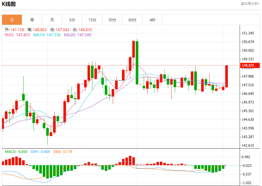 周二盘中,美元/日元报148.857,涨幅1.16%。 今日分析:在148.15之上,看涨,目标价位为148.78,然后为149.05。 技术点评:RI技术指标上,呈现新的上升趋势。 支撑位:148.15147.70147.35 阻力位:149.50149.05148.78 (亚汇网编辑:冰凡)