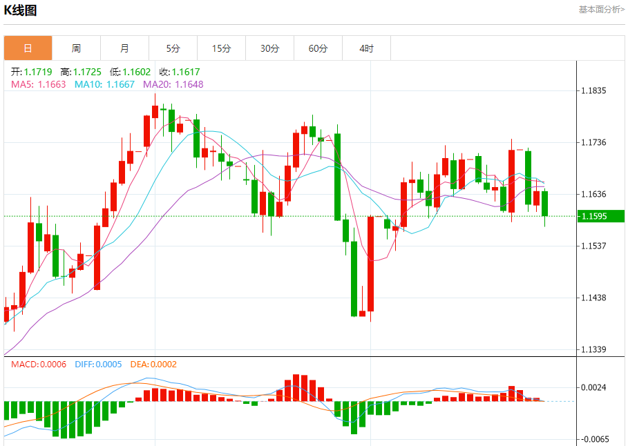 周三盘中,欧元/美元报1.1585,跌幅0.47%。 今日分析:在1.1620之下,看跌,目标价位为1.1560,然后为1.1540。 技术点评:RI技术指标看跌,有进一步下降空间。 支撑位:1.15601.15401.1515 阻力位:1.16651.16501.1620 (亚汇网编辑:冰凡)