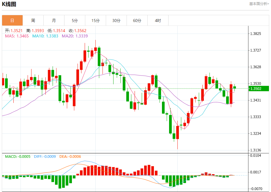 周一盘中,英镑/美元报1.3502,跌幅0.18%。 今日分析:在1.3470之上,看涨,目标价位为1.3545,然后为1.3570。 技术点评:1.3470附近形成了一个支撑的底部,将带来走势短期内的稳定。 支撑位:1.34701.34451.3420 阻力位:1.35951.35701.3545 (亚汇网编辑:冰凡)