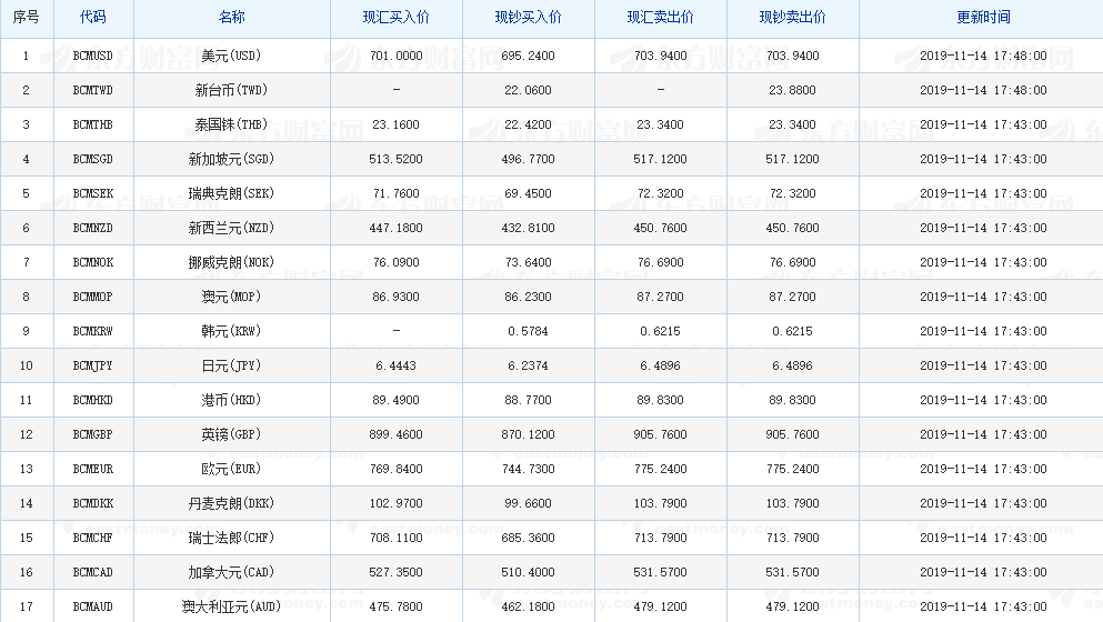 货币名称 交易单位 现汇买入价 现钞买入价 美元(UD) 100 699.57 693.83 日元(JY) 100 6.42 6.22