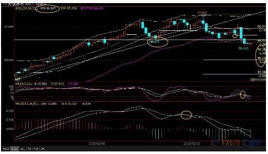 日线级别:震荡下跌;汇价连续四根阴线,且有两根带较长的上影线,暗示上方卖压较强,隔夜更是失守了2月11日低点96.61附近支撑,看空信号有所加强;KDJ死叉信号延续,MACD也有结成死叉的趋势,在收复96.61前,后市偏向进一步下探布林线中轨96.29附近支撑,甚至是96整数关口附近支撑。