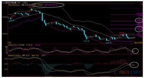 2小时级别:低位震荡,留意布林线轨道1271.31-1279.67区域突破情况;技术面信号比较模糊,短线走势变数较大。