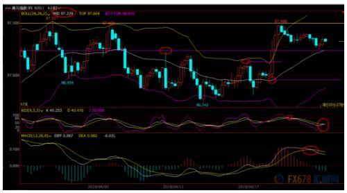 4小时级别:震荡上涨后回调;MACD死叉,KDJ死叉后有重新结成金叉的迹象,汇价受到布林线中轨支撑,目前在97.24附近,在失守该位置前,后市略微偏向多头。