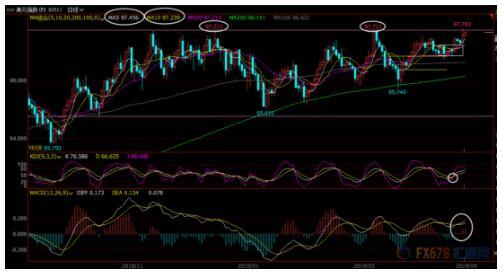 下方5日均线支撑在97.45附近,然后97.22也已经转化为较强的支撑所在(接近10日均线);进一步强支撑在97.00整数关口附近,若意外回落至该位置下方,则增加短线下行风险。