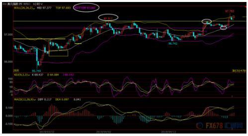 4小时级别:震荡上涨;MACD和KDJ金叉运行,而且97.52位置也已经转化为初步支撑所在,在失守该位置前,后市偏向震荡上涨。