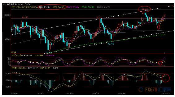 下方5周均线支撑目前在97.76附近,10周均线支撑在97.43附近,20日均线支撑在96.90附近,若意外失守该位置,则增加下行风险。