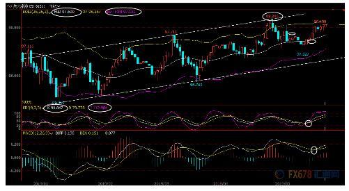 目前初步支撑在98整数关口附近,在失守该位置前,后市依然偏向多头;布林线中轨支撑在97.70附近,若意外失守该位置,则增加短线下行风险。