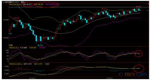 而如果汇价坚守布林线中轨96.88附近支撑,则后市多头仍有机会。布林线上轨阻力在98.22附近,若顶破该位置,则增加看涨信号。