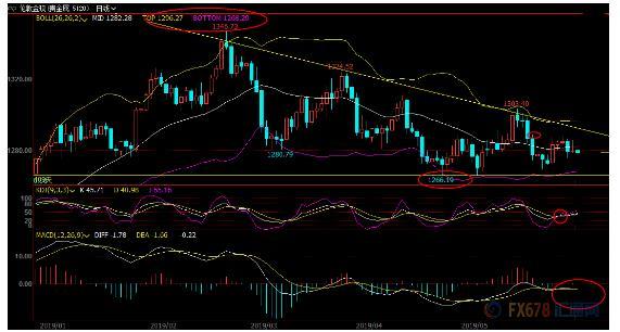 不过,目前各指标信号相对模糊,布林线水平运行,本交易日下破布林线下轨的可能性还比较小;另外,KDJ依然金叉,若意外顶破隔夜改到1285.80附近阻力,增加短线看涨信号。