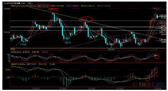 解析:金价未能有效顶破1346附近阻力,需要提防双头顶的形成,而美国和墨西哥达成贸易协议,欧美股市普遍上涨,打压了黄金的避险需求,而且市场对本周美国零售数据的预期比较乐观,金价短线面临调整风险;但中线金价技术面偏向多头。