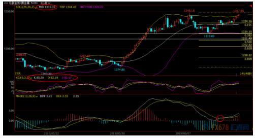 由于MACD轻微顶背离,布林线开口情况还不是特别明显,KDJ也位于超买区域,下方留意布林线中轨1332.23附近支撑,若失守该支撑,则增加短线看空信号。
