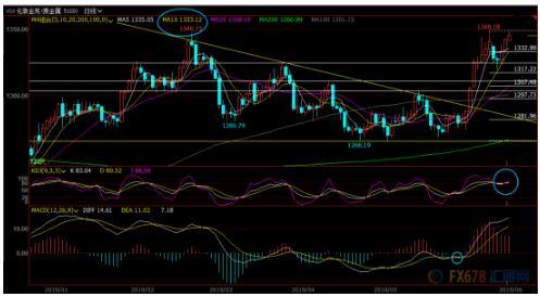 日线级别:震荡上涨;MACD金叉,KDJ重新结成金叉,短线留意上周高点1348.18附近阻力,若顶破该阻力,则有望打开新的上涨空间,中线看下2018年高点1366.05附近阻力;短线留意2018年4月18日高点1355.80附近阻力,然后是1360整数关口附近阻力。
