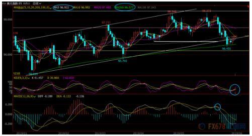 下方留意5日均线96.92附近支撑,若失守该位置,则削弱短线看涨信号;200日均线支撑目前在96.58附近,若意外失守该位置,则增加下行风险。