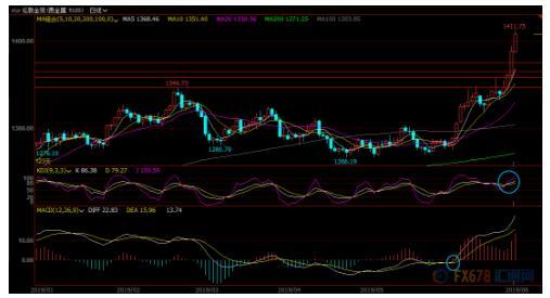 日线级别:单边上涨;KDJ高位金叉延续,MACD金叉延续且红色柱升高,暗示上涨动能较强,金价上一交易日站稳在2016年高点1375.31上方,目前初步顶破了1400整数关口,若能站稳该位置,后市偏向进一步试探2013年8月高点1433.97附近阻力;该位置阻力相对较强,预计在顶破该位置前,金价可能会迎来一波调整行情。