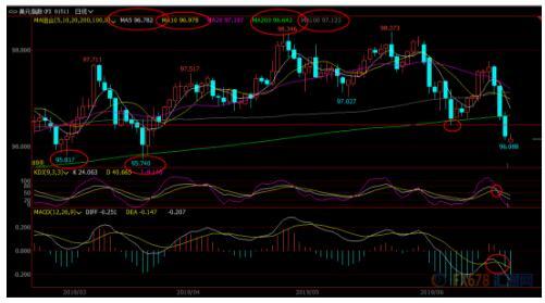 上方布林线中轨96.85已经转化为较强的阻力所在,在收复该位置前,后市偏向下行;若回升至该位置上方,则削弱短线看空信号。