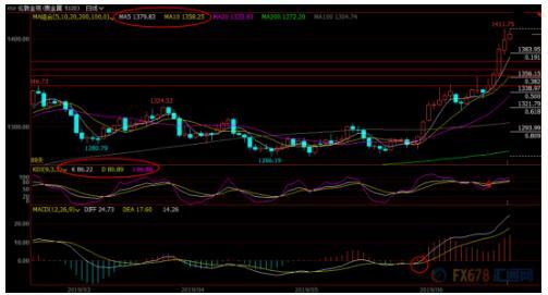 周线级别:震荡上涨;MACD金叉运行,KDJ金叉运行,均线多头排列,金价顶破1375附近强阻力,后市已经转向多头;建议关注2013年8月份高点1433.97附近阻力;2013年6月份高点1423.81附近阻力也值得关注;然后是2013年5月份高点1488.16附近阻力。