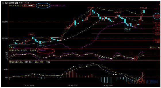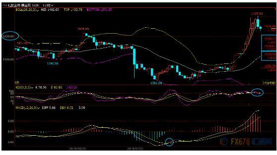 不过,KDJ也接近超买区域,上方阻力较强,如果K线出现“吞没”看空,或者金价跌至19.1%回撤位1416下方,则增加短线下行风险;布林线中轨支撑在1404.04附近;然后是1400整数关口和1396.94附近支撑。