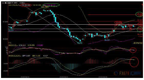 4小时级别:窄幅震荡;短线留意96.57-96.88区域突破情况;MACD轻微死叉,KDJ轻微死叉,短线汇价可能会再次试探布林线中轨96.57附近支撑,由于汇价已经在相对高位调整了一段时间,若汇价坚守该支撑,则多头有望上破96.88附近阻力,并打开新的上涨空间,