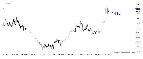 我们预计金价本周将涨向1415美元/盎司。
