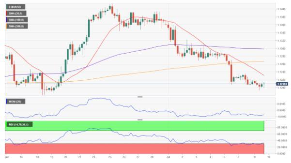 汇价目前徘徊于1.12附近,连续第三日下跌,若美联储主席确认市场预期,汇价料重测年内低点。4小时图技术指标尝试自日低反弹,但缺乏足够动能确认进一步上涨,仍接近超卖。20SMA继续下行,位于现价上方,位于更长均线下方,在1.1235构成短期动力阻力。阻力位于1.1270,支持位于6月18日低点1.1181。