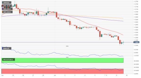 汇价连续第三日下跌,汇价自日低反弹,但受阻于1.2470/80区域。技术上超卖,但没有止跌迹象。日图技术指标进入超卖区域,呈大幅下行斜度,4小时图风险偏下行,汇价远低于看跌的20SMA下方,后者位于1.2520,技术指标仍位于超卖水平,略修正极度超卖。
