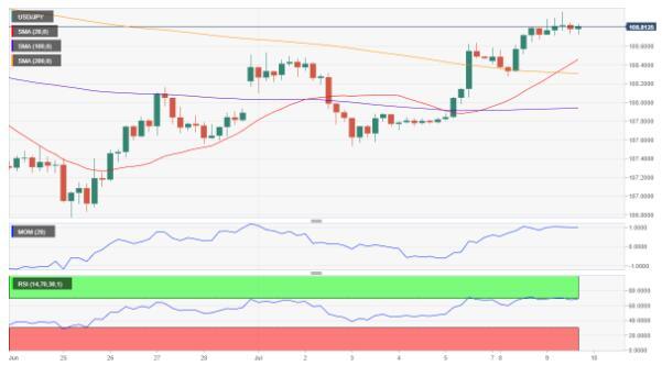 美元/日元未延续突破109.00,部分原因是市场担忧全球经济下滑,特别是美联储主席鲍威尔作证前投机性买盘疲弱。短线技术指标显示汇价仍有望上涨,4小时图显示技术指标自超买回撤,同时美元/日元维持在所有均线上方,20SMA与200 SMA构成金叉,在108.35附近构成支撑。