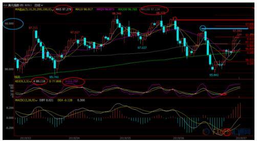下方97.41位置已经转化为初步支撑所在,5日均线支撑目前在97.28附近,强支撑在100日均线97.13附近,若意外回落至该位置下方,则增加短线看空信号。