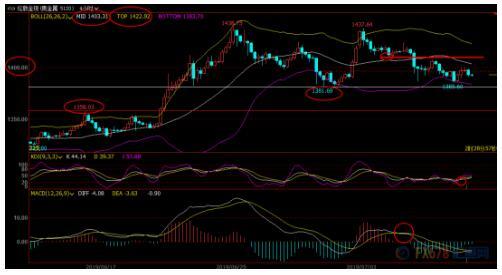 需要提醒的是,金价目前在布林线下轨附近也获得了一些支撑,KDJ结成金叉,若意外上破布林线中轨1403.32附近阻力,则金价仍将维持高位震荡走弱,短线有望重新涨向布林线上轨1422.91附近;另外1410.11附近也存在一定的阻力。