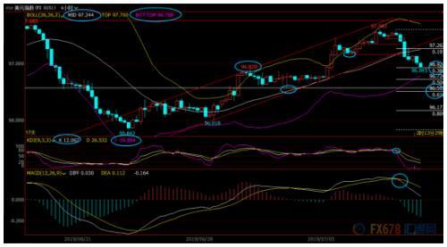 4小时级别:震荡下跌;MACD和KDJ死叉运行,美元指数跌破此前的短线上涨通道,也失守布林线中轨,短线偏向进一步试探布林线下轨96.79附近支撑;然后短线涨势的61.8%回撤位支撑在96.51附近,若进一步下破,则增加中线看空信号。