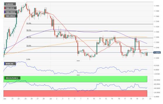 汇价整理于7月区间底部,位于20点区间。风险仍偏下行,汇价跌破7月跌势的23.6%回档位1.1245,4小时图技术指标和长期前景一致,汇价仍位于所有均线下方,100SMA跌破200SMA,后者和38.2%回档位重合于1.1280,技术指标位于负水平,呈温和下行动能,未能确认进一步跌势。汇价7月在1.1192筑底,6月在1.1181筑底,如破将打开测试年内低点1.1106的大门。若突破1.1280阻力将移除下跌风险。