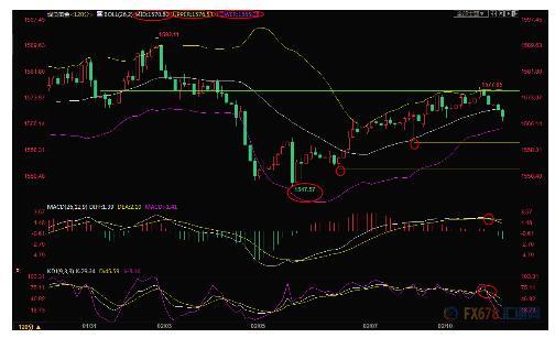 2小时级别:震荡上周受阻;金价受阻于布林线上轨附近阻力,K线出现“吞没”看空信号,KDJ死叉运行,MACD死叉,目前初步失守布林线中轨1570.80,短线偏向进一步试探布林线下轨1565.07附近,若下破该支撑,则增加后市看空信号;进一步支撑在1560.97和1552.59附近。