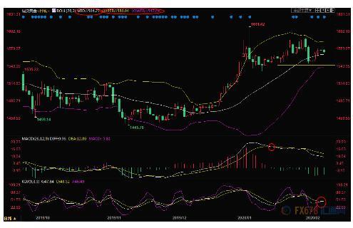 日线级别:震荡;布林线收口后水平运行,中线走势可以参考布林线轨道1542.49-1586.05区域突破情况;目前MACD死叉信号延续,KDJ金叉形成受阻,2月5日-7日金价温和反弹,上一交易日录得十字星,而且是受阻于1580关口附近阻力,暗示反弹动能减弱,金价面临重回跌势的风险,初步支撑在布林线中轨1564.26附近,若失守该支撑,则金价增加金价跌向布林线下轨1542.49附近支撑的可能性;而若进一步下破,则增加中线看空信号。