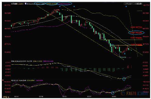 4小时级别:单边下跌后低位震荡;目前MACD金叉,KDJ金叉,若能顶破布林线中轨97.64附近阻力(接近23.6%回撤位),则增加短线看涨信号;进一步阻力参考38.2%回撤位98.07附近;布林线上轨在50%回撤位98.42附近。