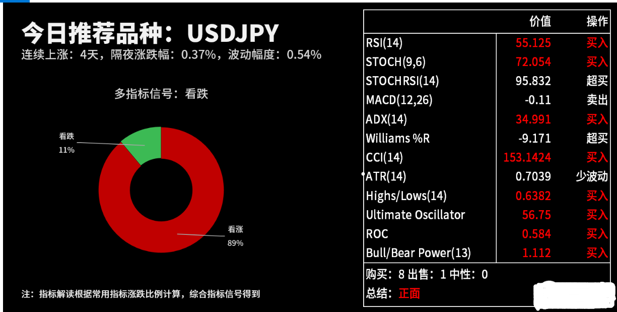 美元日元(上涨:4天,隔夜涨跌幅:0.37%,波动幅度:0.54%)。