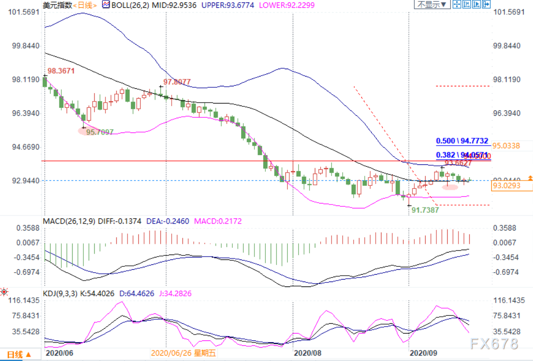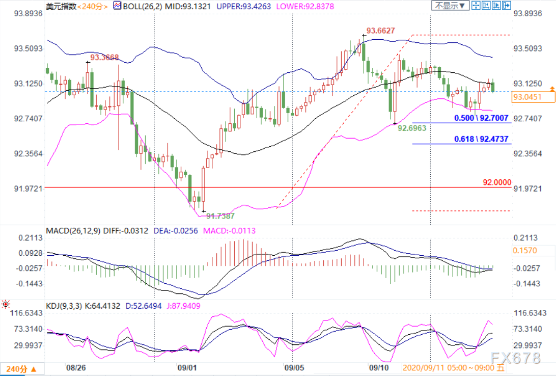 上行阻力,先留意布林带中轨93.21;进一步阻力为上看布林带上轨93.53,这与8月21日高点相近,参考性较强。强阻力上看8月3日高点94.00,该位置有明显压制性。此外,9月9日高点93.66投资者也需保持留意。