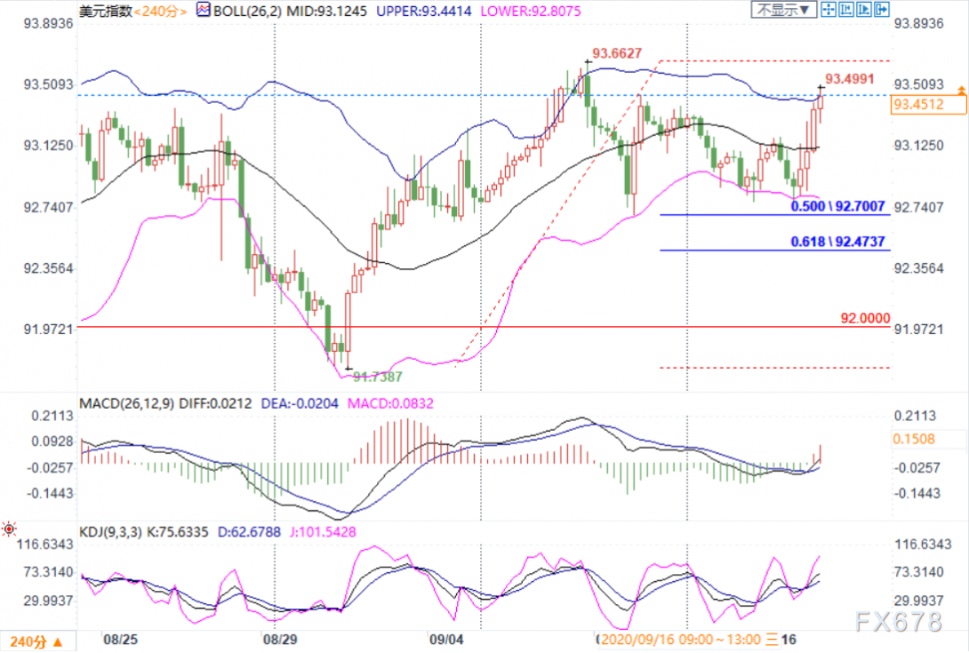 上行阻力,先留意9月9日高点93.66,强阻力上看8月3日高点94.00,该位置有明显压制性。