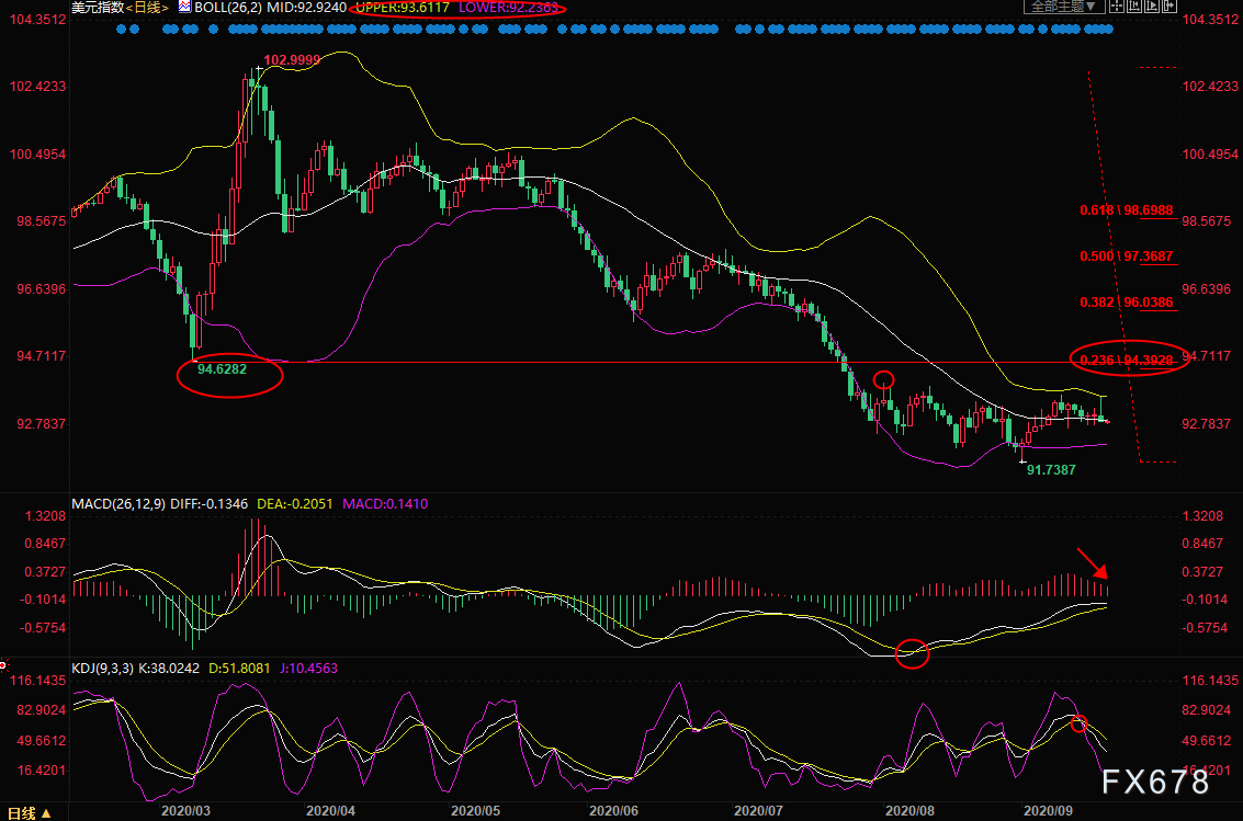 另外,在9月10日低点92.69附近,也还存在一些支撑;若失守该支撑,则增加汇价下探布林线下轨92.24附近支撑的可能性。