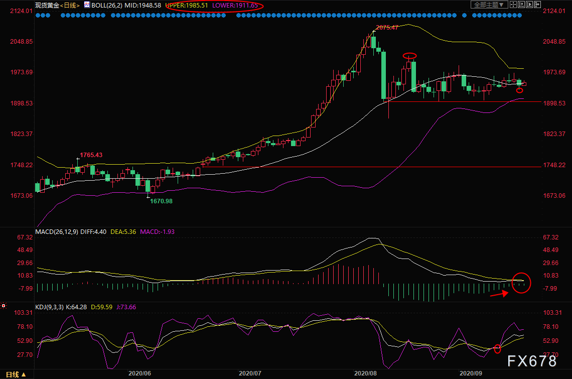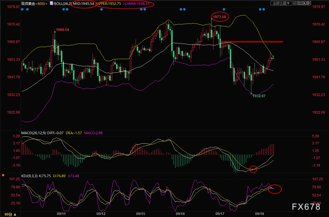 由于MACD金叉运行,若能站稳在布林线上轨1952.77上方,则金价可能会重新试探近期高点1973.56附近阻力。