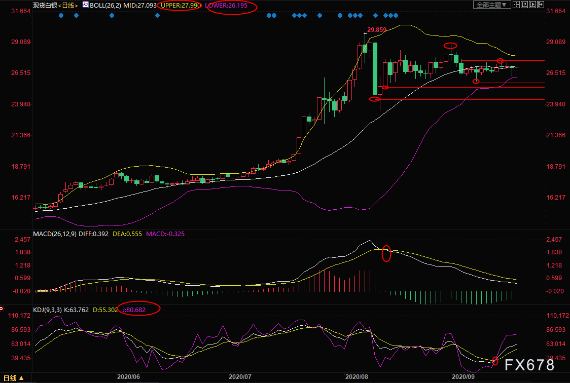 上方初步阻力在本周高点27.63附近,布林线上轨阻力在28.00附近,若强势顶破该阻力在,则银价有望重新试探9月1日高点28.91附近阻力。