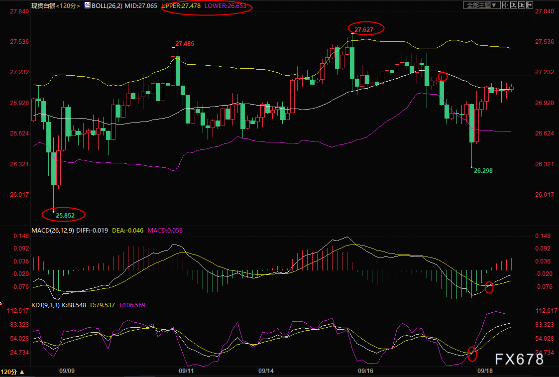 2小时级别:震荡;留意布林线轨道26.65-27.48区域突破情况;由于MACD金叉,KDJ金叉,此前布林线下轨失而复得,短线银价偏向试探布林线上轨27.48附近阻力,能否上破还有待观察。