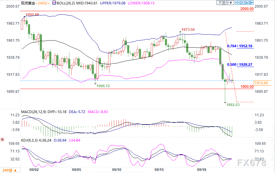 下方强支撑留意1900关口,只是近期重要的心理防线,金价前一交易日一度下破,随后再度拉起。需要注意,一旦金价彻底失守该关口,将提振市场看空情绪,进一步支撑下看前低1882.53。