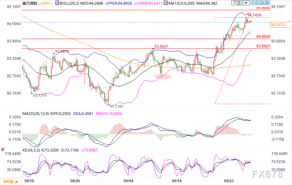 下方支撑线重点关注94.00关口,若美元指数回落该关口下方,短线料再度回归此前低位震荡区间。进一步支撑依次留意55日均线93.55、以及布林带中轨93.24。若跌破,强支撑下看9月1日低点91.74附近;此外布林带下轨91.92附近也有一定支撑。