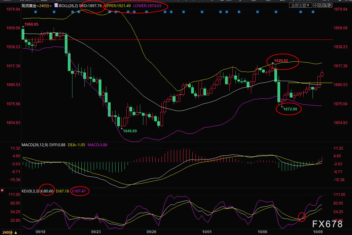 4小时级别:震荡;金价自布林线下轨附近震荡上涨,MACD金叉,KDJ金叉,短线有望进一步试探布林线上轨1921.49附近阻力,也接近近期高点阻力所在;若进一步上破,则增加后市看涨信号。